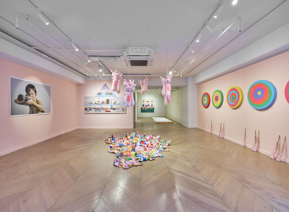 Tüketim kültürü ve bilinçdışının kesişiminde yer alan “Rabbits” yerleştirmesi ise peluş tavşanlar, oyuncak silahlar ve hedef tahtaları aracılığıyla arzunun çelişkili doğasını hem eğlenceli hem de tehditkâr bir dille tartışmaya açıyor. Kültürel ve felsefi referanslarla örülü bir diyalog kuran Rabbits, gerçekliği reddetme hâlini ve “sığınak mekânları”nı —matrikslerden sanal gerçeklik deneyimlerine kadar— tüketim merkezli bir yaşamdan kaçış yolları olarak sorgular.